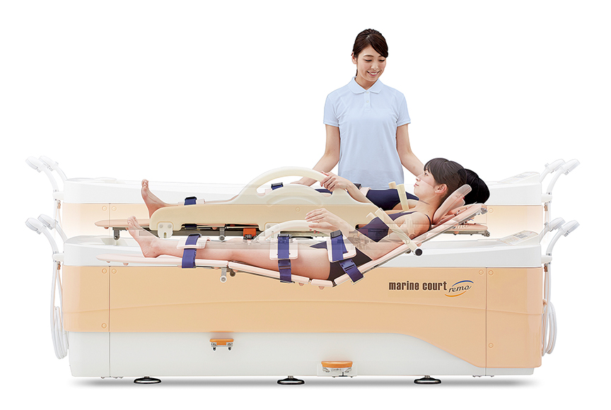 介助者と入浴者の距離はいつも一定。入浴者といつも一緒だから安心。足元を気にすることなく自然な歩行姿勢で、担架を浴槽へスライドすることができます。